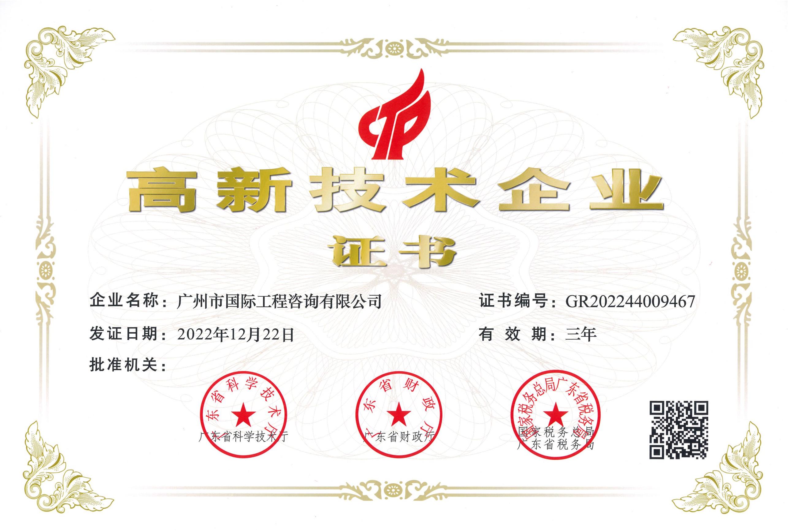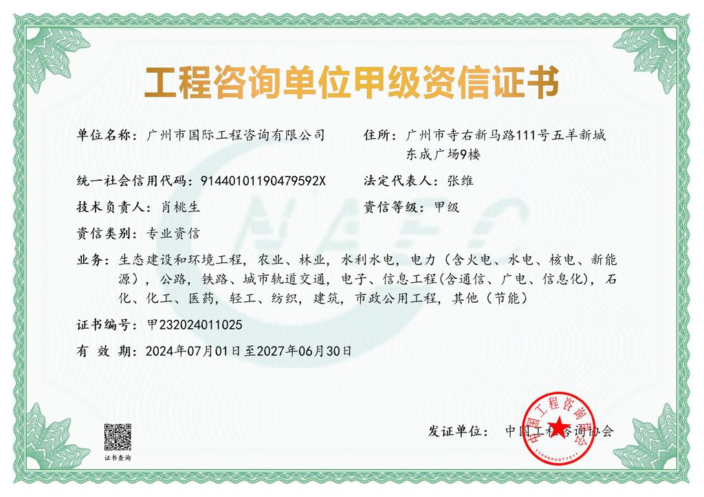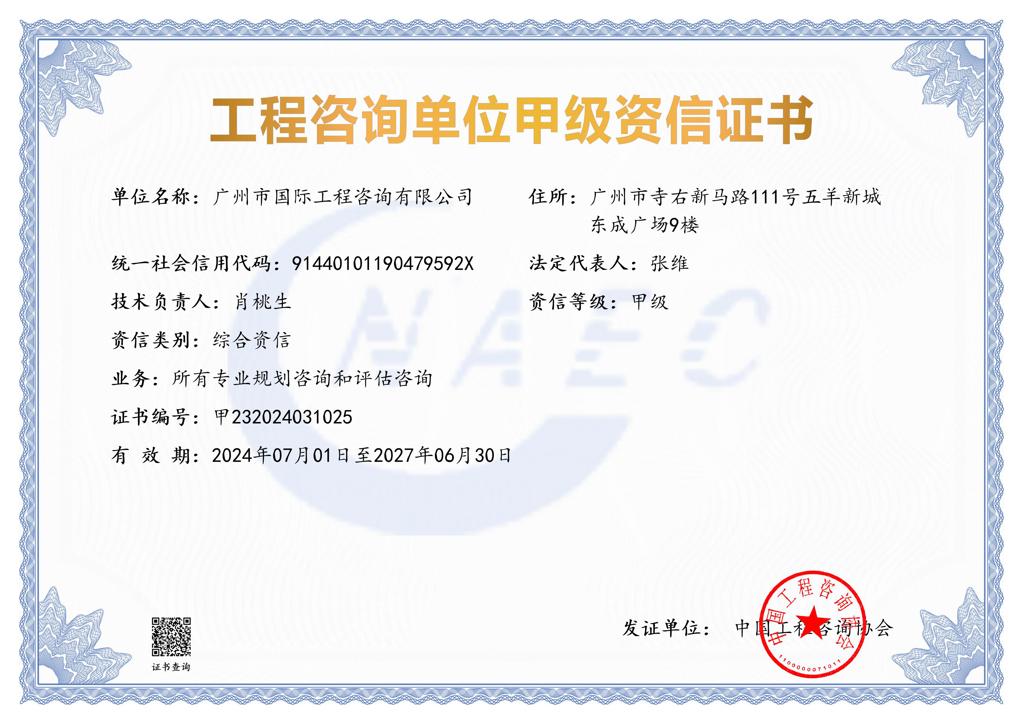 工程咨詢單位甲級資信證書(綜合資信)
