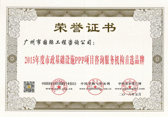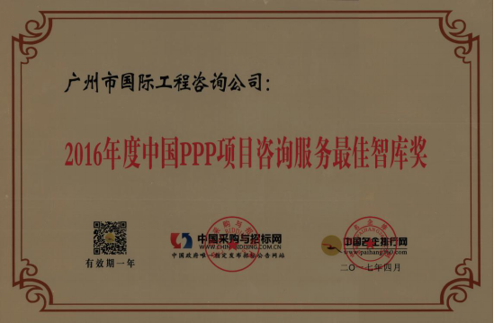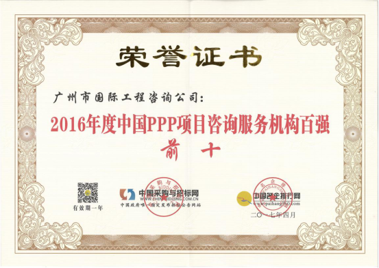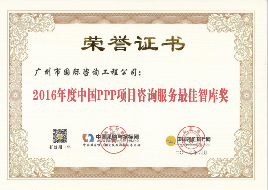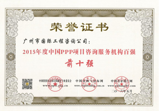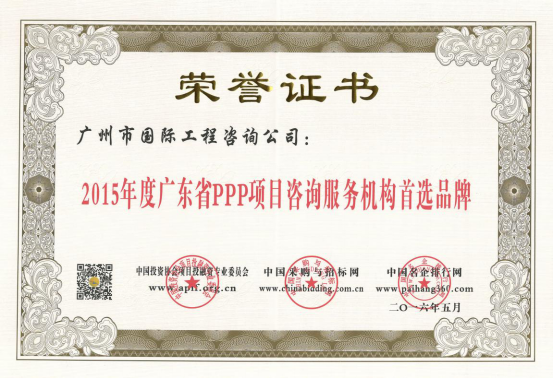 廣州市國際工程咨詢公司已連續(xù)兩年,蟬聯(lián)年度中國PPP項目咨詢服務(wù)機構(gòu)十大頂級品牌等獎項。