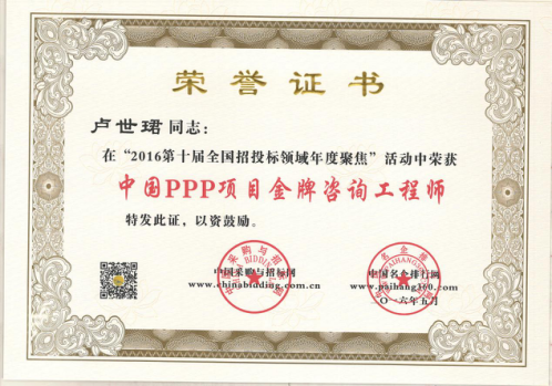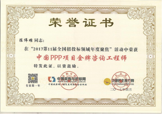 為在PPP咨詢行業(yè)內(nèi)樹立標(biāo)桿企業(yè),國家發(fā)改委中國投資協(xié)會項目投融資專業(yè)委員會、中國采購與招標(biāo)網(wǎng)、中國名企排行網(wǎng)聯(lián)合主辦了“第10、11屆PPP咨詢服務(wù)機構(gòu)評價推薦”活動。秉承“公開、公平、公正、誠實信用”的原則,最終遴選出年度中國PPP咨詢服務(wù)機構(gòu)類大獎。在活動中,廣州市國際工程咨詢公司榮獲“2015、2016年度中國PPP項目咨詢服務(wù)機構(gòu)百強(前十強)”,”2016年度中國PPP項目咨詢服務(wù)機構(gòu)十大頂級品牌”、”2016年度中國PPP項目咨詢服務(wù)最佳智庫獎”、”2015年度廣東省PPP項目咨詢服務(wù)機構(gòu)首選品牌”、”2015年度市政基礎(chǔ)設(shè)施PPP項目咨詢服務(wù)機構(gòu)首選品牌”等集體榮譽類大獎。此外,公司PPP項目咨詢中心主任肖桃生、副主任盧世君、陳偉雄、孫亮分別榮獲2015、2016年度中國PPP項目金牌咨詢工程師稱號。