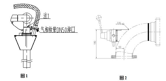 原鶴管從圖1中將注1垂管連接件(包含旋轉接頭法蘭、彎頭、鋼法蘭)整體更換成圖2所示零部件。配件由賣方提供。如右圖2所示: